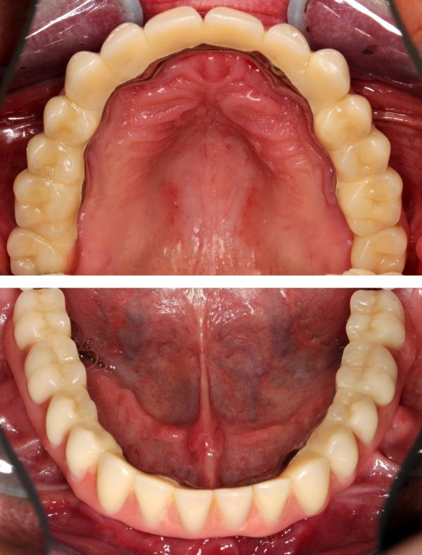 Die prothetische Rekonstruktion erfolgte im ersten Fall über eine konuskronengetragene Prothese. Intraoral ist sie absolut festsitzend, somit richtlinienentsprechend, kann jedoch vom Patienten herausgenommen werden. Wir bevorzugen diese Versorgungsart bei zahnlosen Patienten und auch bei kombinierter Versorgung mit noch vorhandenen Restzähnen, da sie einfacher zu hygienisieren und somit parodontalhygienisch sicherer ist. Zudem ist sie auch bei Verlust eines Pfeilers noch verwendbar und kann ggf. erweitert werden. Im zweiten Fall erfolgte die Rekonstruktion über vier die Vorgabe erfüllende festsitzende Einzelzahnkronen.