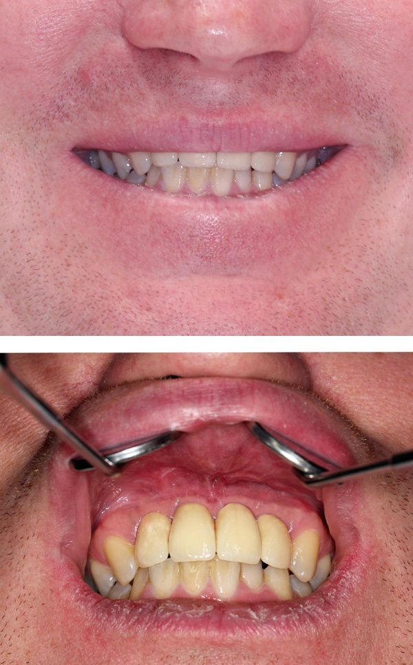 Die endgültige prothetische Versorgung erfolgte im Fachzahnärztlichen Zentrum des Bundeswehrkrankenhauses Hamburg auf Patientenwunsch mit 4 verblendeten Nichtedelmetallkronen (Abb. 14). Einer erneuten Weichgewebsplastik zur Konturverbesserung steht der Patient ablehnend gegenüber.