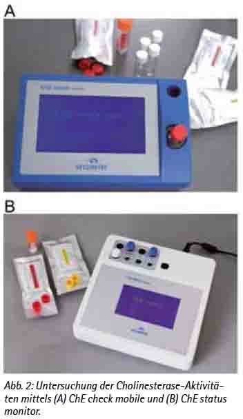 Das ChE check mobile (Abb. 2A) erlaubt über die Analyse eines einzigen Tropfen Blutes nach Fingerkuppenpunktion in Minutenschnelle eine Beurteilung der Vergiftungssituation durch Inhibitoren der Cholinesterasen. Mit Hilfe des kompakten batterie- oder netzstrom-betriebenen Gerätes können in einfachen Arbeitsschritten, die auf einem integrierten Bildschirm erläutert werden, die Enzymaktivitäten der Acetylcholinesterase (AChE) aus Erythrozyten sowie die der Plasmacholinesterase (Butyrylcholinesterase, BChE) quantifiziert werden.