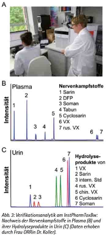 Die valide Detektion der Spuren an CKS und ihren Abbau- und Reaktionsprodukten erfordert sowohl eine selektive wie auch hoch sensitive Technik. Diese Ansprüche werden von moderner Massenspektrometrie (MS) erfüllt, die in on-line Kopplung mit GC und LC weite Verbreitung in der Analytik gefunden hat. Ein Optimum an Selektivität (Detektion genau eines bestimmten Analyten unbeeinflusst von anderen Probeninhaltsstoffen) ermöglicht die Tandem-MS (MS/MS). Abbildung 3 illustriert exemplarisch die Messergebnisse (Chromatogramme) der GC-MS (Abb. 3B) und LC-MS/MS Analysen (Abb. 3C) von Kampfstoffgemischen und ihren Abbauprodukten in Plasma und Urin. Wie im Leistungsverzeichnis des Qualitätsmanagementsystems von InstPharmToxBw aufgeführt, verfügt das Institut über Massenspektrometrie-basierte Methoden zum Nachweis der Nervenkampfstoffe des G-Typs (Tabun, Sarin, Soman, Cyclosarin) und des V-Typs (VX, chinesisches und russisches VX) sowie zum Nachweis des Hautkampfstoffes Schwefellost und ihrer Hydrolyseprodukte.