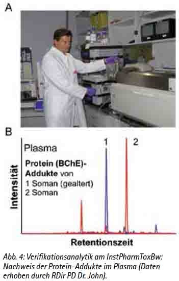 Die Leistungsfähigkeit dieser Methodik konnte jüngst in einer Übung der OVCW unter Beweis gestellt werden. Bei dieser Übung (4. Biomedical Confidence Building Exercise) gelang es InstPharmToxBw zu beweisen, dass dem Plasma zuvor geringste Mengen der Nervenkampfstoffe VX und Soman (1 – 5 ng/ml) zugesetzt waren (Abb. 4B). Die entsprechenden Konzentrationen wären in vivo deutlich unterhalb einer letalen Dosis gewesen. So dokumentierten die Resultate, dass die gewählte Methodik auch zum Nachweis nicht tödlich wirkender Expositionen einsetzbar ist. Ein weiteres sehr effizientes Verfahren, das zum Nachweis des NKS die Präsenz von Proteinaddukten nutzt, ist die Fluorid-induzierte Reaktivierung. Auf eine weitergehende Darstellung soll an dieser Stelle jedoch verzichtet werden.