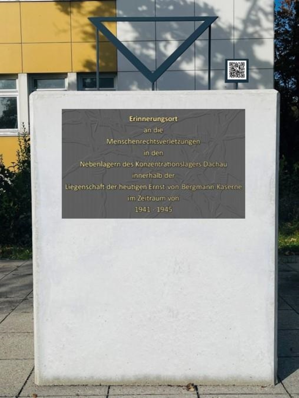 Die Idee, eine Gedenkstele zur Erinnerung an die Menschenrechtsverletzungen in der heutigen Ernst-von-Bergmann-Kaserne zu schaffen, entstand während meiner Recherche über das Nebenlager „SS-Standortverwaltung“. Der Vorschlag zur Errichtung wurde im Jahr 2022 vom Kommandeur der Sanitätsakademie der Bundeswehr gebilligt. Die Gedenkstele wurde im Rahmen des Erlasses „Truppenselbstbau“ gestaltet, gemäß dem Motto „Von der Truppe für die Truppe“.