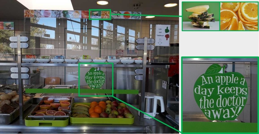 - Anbringen attraktiver Bilder von Obst und des Spruchs „an apple a day keeps the doctor away“ über der Obstausgabe;