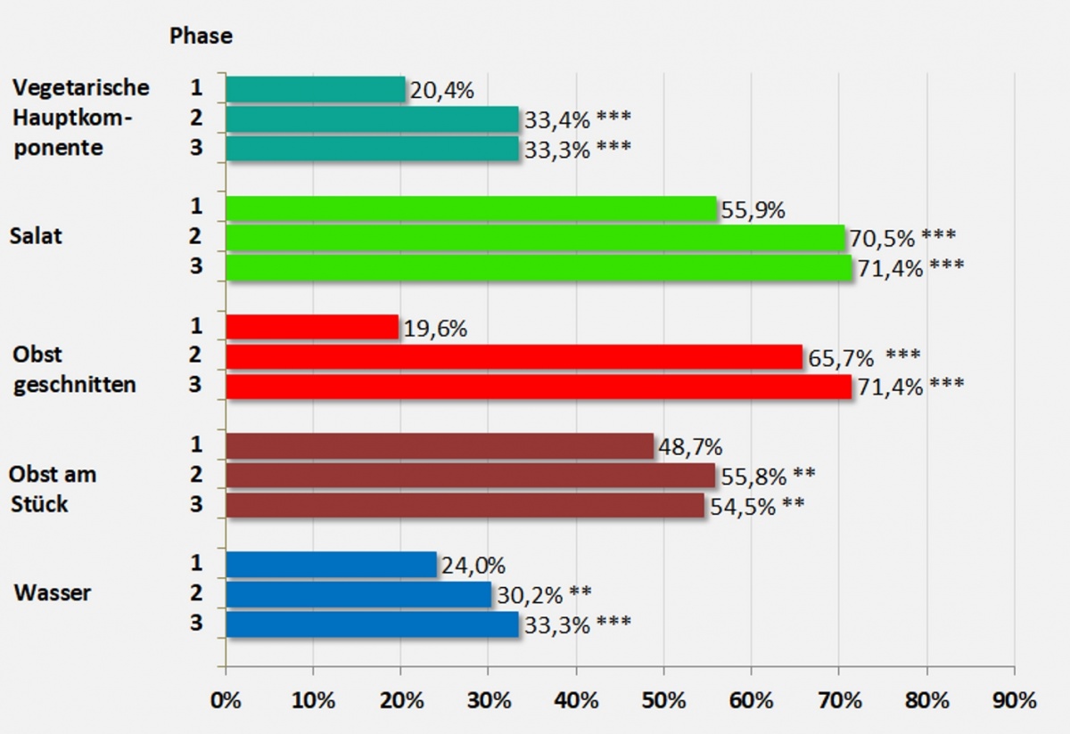 Die vegetarische Hauptkomponente wählten vor Einführung der Nudging-Maßnahmen 20,4 % der Essensgäste. Kurzfristig nach ihrer Einführung stieg der Anteil auf 33,4 % (+ 13,0 Prozentpunkte; CHI2=35,2; p < 0,001) und blieb mittelfristig bei 33,3 % (+12,8 Prozentpunkte; CHI2=28,4; p < 0,001).