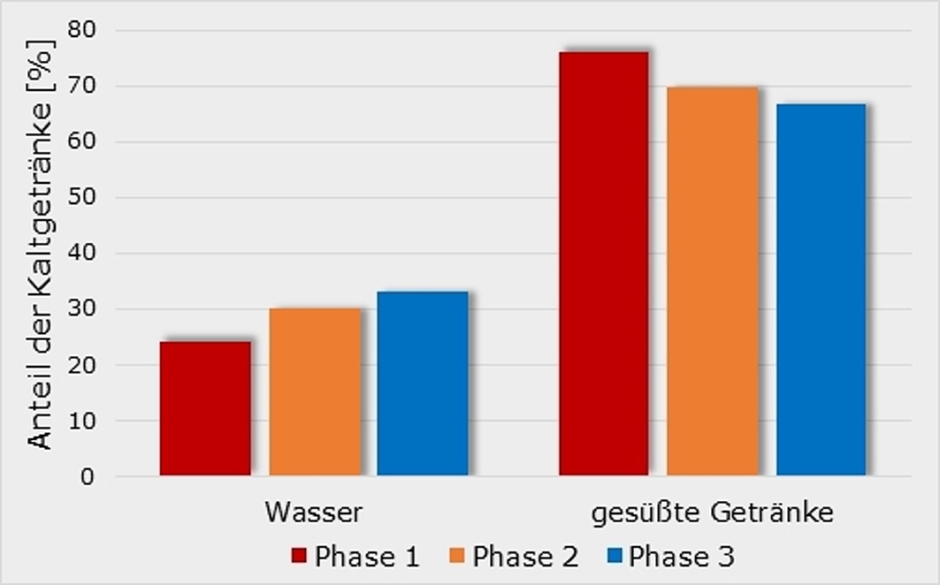 Wasser machte ursprünglich einen Anteil von 24,0 % an allen Getränken aus. Dieser erhöhte sich kurzfristig nach Einführung der Maßnahmen auf 30,2 % (+6,2 Prozentpunkte; CHI2=9,9; p = 0,002) und mittelfristig weiter auf 33,3 % (+9,3 Prozentpunkte; CHI2=18,4; p < 0,001). Der Anteil gesüßter Getränke sank im Gegenzug in einer vergleichbaren Größenordnung.