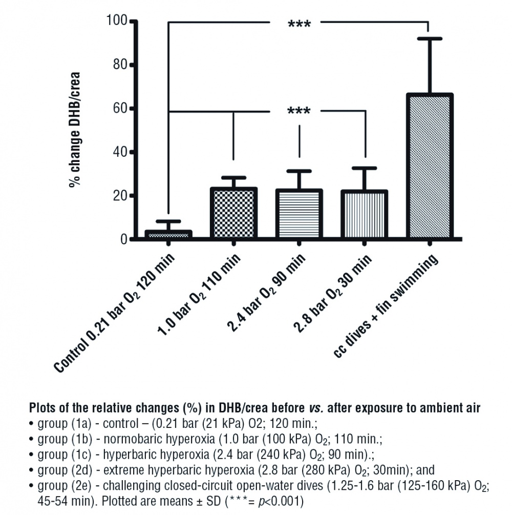Kürzlich konnte durch unsere Gruppe nachgewiesen werden, dass es unter Hyperoxie zu einem signifikanten Anstieg der DHB im Urin kommt, hier also ein erhöhter oxidativer Stress nachzuweisen ist. Darüber hinaus zeigten Urinproben von Kampfschwimmern nach Tauchgängen mit dem geschlossenen Sauerstoff-Kreislauftauchgerät LAR V (Dräger™) Anstiege der DHB, die weit über den Werten für reine Hyperoxiebedingungen lagen. Hier ist zu vermuten, dass die erhebliche körperliche Belastung während der Tauchgänge im Freiwasser ganz wesentlich zu dem gemessenen Anstieg der DHB in der Urinprobe vom Tauchgang im Vergleich zur vorherigen Ruhephase beigetragen hat, dass also die Kombination von Hyperoxie und körperlicher Belastung zu einem überadditiven Effekt auf messbare Biomarker für oxidativen Stress führt (Abbildung 1) [8 – 10].