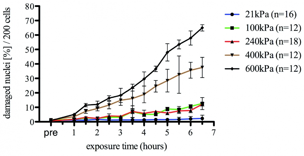 Die Dosis-Wirkungsbeziehungen zwischen pO2 und Exposi-tionsdauer der isolierten Zellen in der Experimentaldruckkammer einerseits und prozentualem Anteil geschädigter Nuklei der PBMC andererseits sind in Abbildung 3 dargestellt.