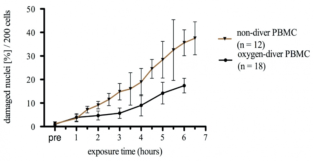 Wir untersuchten deshalb im eigenen Modell isolierte PBMCs von Nichttauchern im Vergleich zu aktiven Kampfschwimmern, die regelmäßig einer erheblichen Hyperoxie um 150 kPa pO2 mit Expositionszeiten bis zu maximal drei Stunden unter hoher körperlicher Belastung ausgesetzt sind, unter der Hypothese einer Adaptation an Hyperoxiestress.