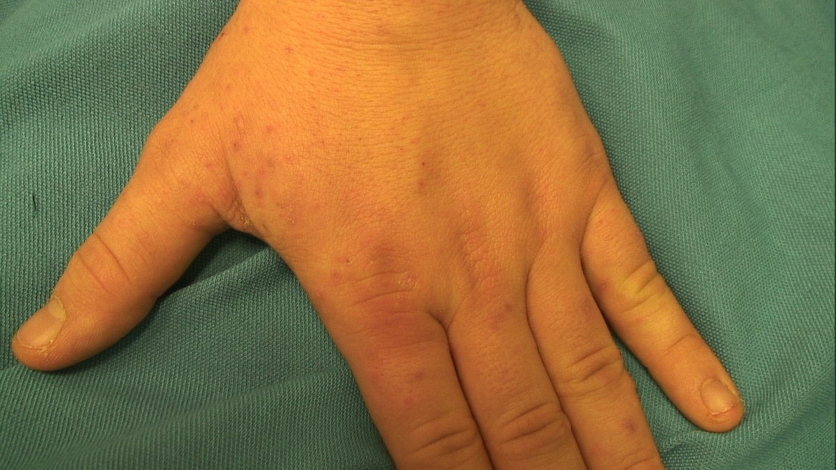 Ein 30-jähriger Patient stellte sich – durch den Truppenarzt überwiesen – in der dermatologischen Fachuntersuchungsstelle mit einem seit 14 Tagen bestehenden „unklaren Penisausschlag“ vor. Vor einer Woche habe er im Rahmen der Einsatzvorbereitung eine feste Unterkunft auf einem Truppenübungsplatz bezogen. Vorerkrankungen bestünden keine; er lebe in einer festen Beziehung, wobei die Partnerin seit etwa fünf Wochen ebenfalls über einen ähnlichen Juckreiz klage. Dieser bestünde insbesondere nachts an den Handrücken, Fingerzwischenräumen und palmaren Handgelenken. Der sorgfältigen Inspektion des Truppenarztes ist die Erkennung der auffälligen erythematösen Papeln an der Glans penis zu verdanken, die dem Patienten bis dahin nicht aufgefallen waren.