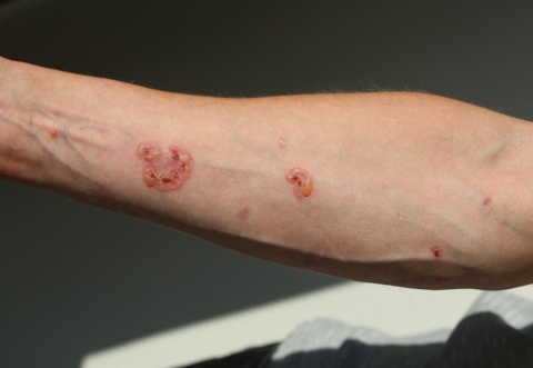 Die Hauteffloreszenzen (lineare oder kommaförmige Papeln, Rötung und Schuppung mit Exkoriationen) treten am häufigsten intertriginös, umbilikal, axillär, interdigital und popliteal auf (Abbildung 5). Das gemeinsame Auftreten mit dem nächt-lichen quälenden Juckreiz wird als immunologische Antwort des Organismus auf die Milben, ihre Bestandteile sowie ihren Kot interpretiert und setzt nicht zwingend den Milbenbefall an der betroffenen Lokalisation voraus.