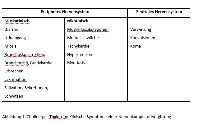 Nach Exposition gegenüber Nervenkampfstoffen und Aufnahme über die (Schleim-) Haut bilden sich die Symptome in Abhängigkeit des Nervenkampfstoffes und des Expositionsweges innerhalb von wenigen Minuten bis zu mehreren Stunden aus. Es kommt zu einer Überstimulation an muskarinergen und nikotinergen Acetylcholinrezeptoren, was zu den muskarinischen Symptomen Diarrhö, Urinabgang, Miosis, Bronchospasmus, Bronchorrhö, Bradykardie, Erbrechen, Lakrimation, Salivation, Sekretion, Schwitzen (DUMBELS) und zu den nikotinischen Symptomen Muskelfaszikulationen, Muskelschwäche, Tachykardie, Hypertension, Mydriasis führt (Abbildung 1). Auf Grund der breiten Verteilung von nikotinergen und muskarinergen Acetylcholinrezeptoren und damit verbunden der Präsenz von Acetylcholinesterase kommt es zum Teil zu gegenläufigen Symptomen, was eine Diagnostik erschweren kann. So lassen bei Auffinden eines Vergiftungsopfers die Symptome erschwerte Atmung, Bewusstlosigkeit und Miosis sowohl die Verdachtsdiagnose Opioid- als auch Nervenkampfstoffvergiftung zu.