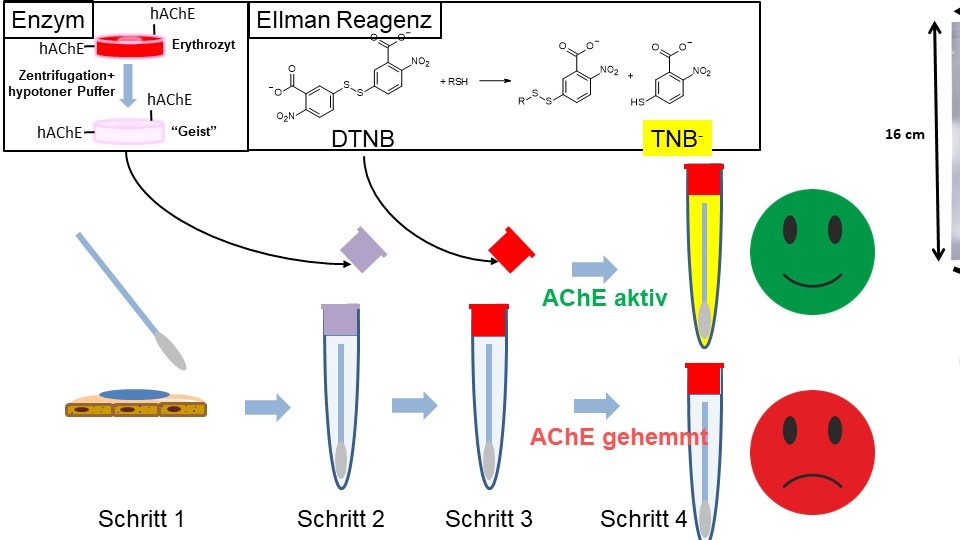 Nach einminütiger Inkubation der gelösten AChE mit etwaigem Nervenkampfstoff wird der gelbe