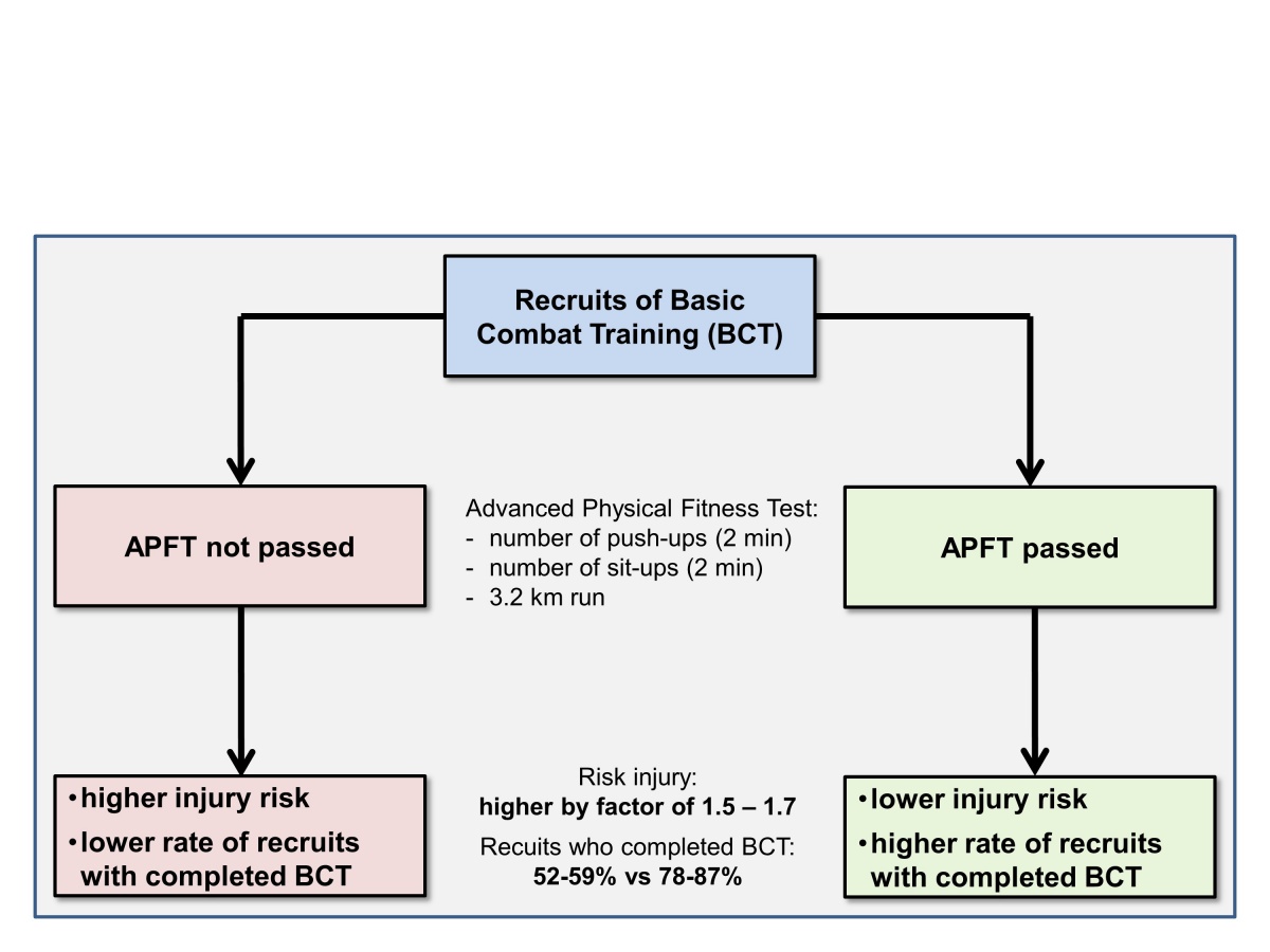 Findings of the US armed forces show examples of how we can handle this modifiable risk factor in terms of a prevention strategy with, at the same time, better performance of course-related tasks. It was found out that US Army recruits were more likely to get hurt during Basic Combat Training (BCT), by a factor of 1.5 to 1.7, when they had not passed the initial Advanced Physical Fitness Test (APFT). Furthermore, the rate of recruits without passing initial APFT who finalised the BCT (52 % to 59 %) was lower than of those recruits who had passed the initial APFT (78% to 87%) [14] (see Figure 1). After the introduction of an eight-week pre-fitness training for recruits who had not passed the APFT with the overall objective of integrating them into BCT until the end of this pre-training, the risk of injury could be lowered significantly and, at the same time, the rate of recruits who successful finalised the BCT could be improved in an impressive way – from 59% to 83% with male recruits and from 52% to 69% with female recruits [14].
