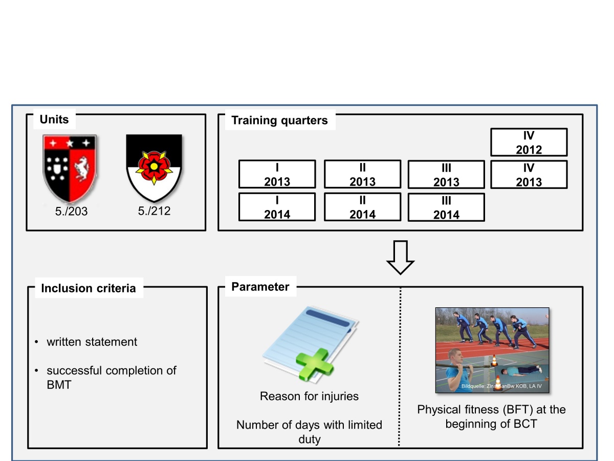 During eight coherent training quarters (IV/2012 to III/2014), data on the Bundeswehr recruits who participated in the study was taken from their health files and from the standard Basis-Fitness-Test (BFT) [6, 20] that they were put through at the start of their BMT. The recruits then underwent their basic training in the training companies of Tank Battalion 203 (5./203) or of Armoured Infantry Battalion 212 (5./212) which are based at the same barracks in Augustdorf, North Rhine-Westphalia, Germany (see Figure 3).
