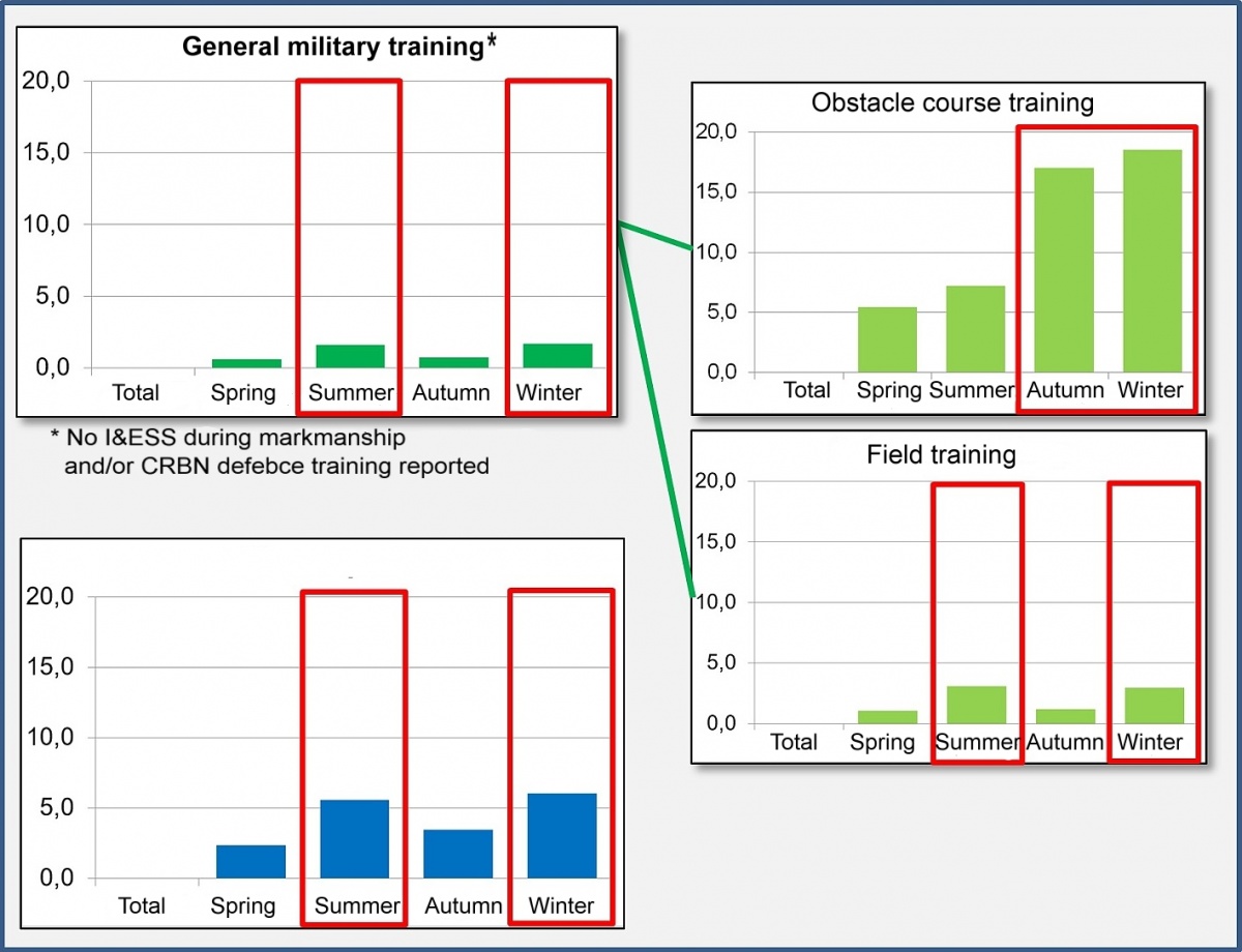 The analysis of I&ESS cases per 1,000 hours of specific training showed an incidence of 1.09 I&ESS/1,000 hours during general military training and 4.17 I&ESS/1,000 hours during mandatory physical training. A sub-analysis of the incidence of I&ESS during general military training, which comprised marksmanship training, CBRN defence training, obstacle course training and field training, revealed that a high number of I&ESS were incurred during obstacle course training, while no cases were incurred during marksmanship and CBRN defence training (see Figure 5). An increase in the number of I&ESS was also observed during the summer and winter quarters, especially as a result of field training and mandatory physical training (see Table 3).