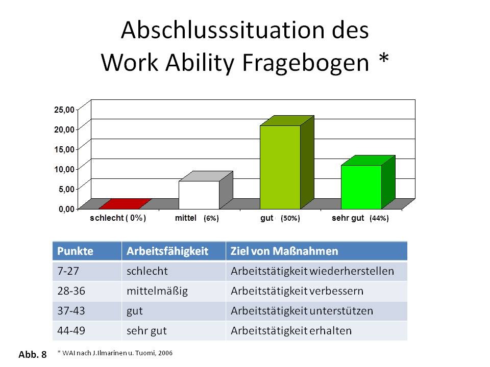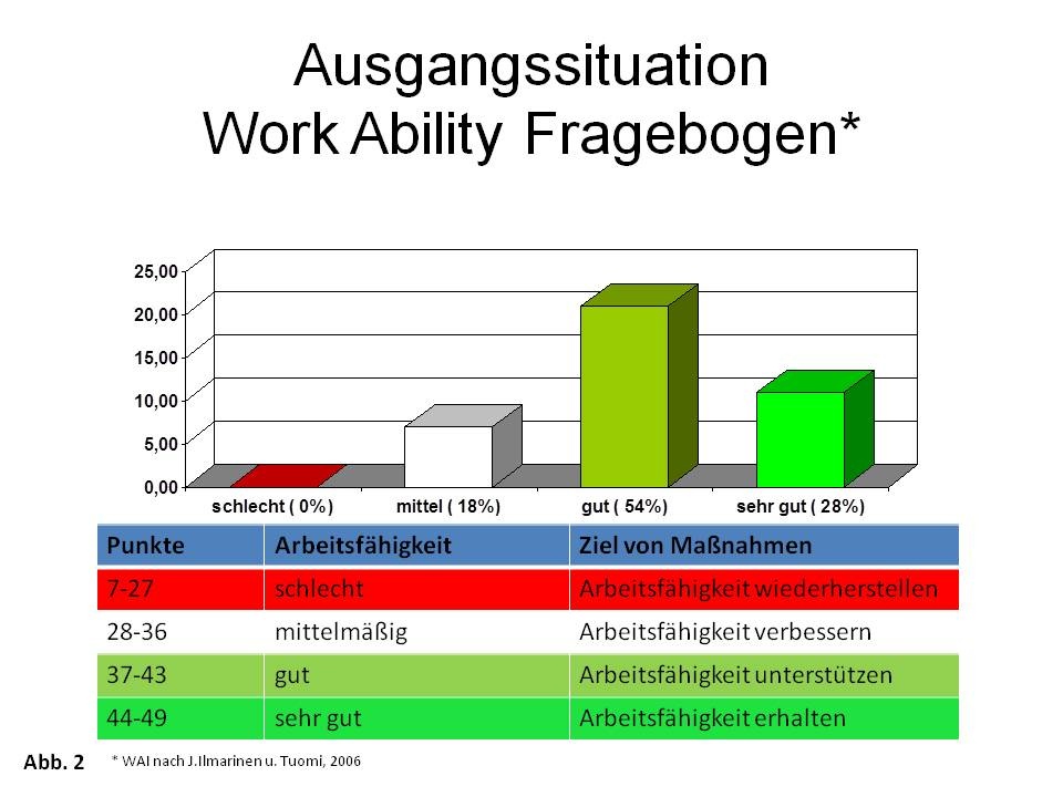 Bei den vorgestellten Probanden wurde im Rahmen der G 26.3 – Vorsorge neben der Erhebung der allgemeinen Anamnese mittels BAPRO-Bogen (Anamnese BAsis-PROgramm für arbeitsmedizinische Vorsorgeuntersuchungen) und ihrer Arbeitsanamnese ihre aktuelle physische und psychische Situation mittels Fragebögen anhand des Work Ability Index (Abb. 2), Freiburger Aktivitätsindex (Abb. 3) und eines chronobiologischen Fragebogens (Abb.5) auch die aktuellen Gesundheitsdaten (Gewicht, Taillenumfang, BMI) (Abb. 4) sowie im Rahmen der Ergometrie die Physical Working Capacity (PWC 150 (Herzfrequenz 150 /min durch die Masse des Probanden)) in Abhängigkeit des Altersdurchschnitts erhoben. Als Laborparameter wurden Urinstatus, BSG, Blutbild, G-GT, GOT, GPT und der Nüchternblutzucker bestimmt.