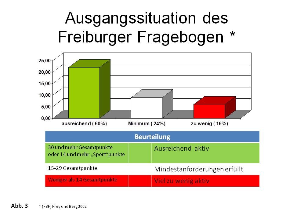 Jeder Proband erhielt eine individuelle Ernährungsberatung sowie eine auf Grundlage des Freiburger Aktivitätsindex individuell erstellt Trainingsberatung zum Kraft- und Ausdauertraining. Das vorgeschlagene Trainingsprogramm umfasste 120 Minuten. Es standen davon 90 Minuten auf dem Dienstplan. 30 Minuten mussten zusätzlich durch die Teilnehmer durch Freizeitaktivitäten oder gezielten Sport in Eigenregie (s. o) erbracht werden (Abb. 2).