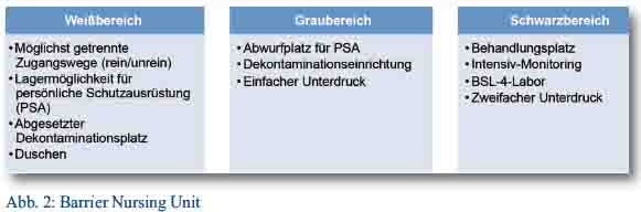 Alle notwendigen Maßnahmen einschließlich der infrastrukturellen Anpassung des Behandlungsbereichs und persönlicher Schutzausrüstung (PSA) für medizinisches Fachpersonal werden unter dem Stichwort “Barrier Nursing” zusammengefasst. Die Behandlungseinrichtung mit einer zuvor festgelegten funktionellen Einteilung in einen Weiß-, Grau und Schwarzbereich wird demzufolge als “Barrier Nursing Unit” (BNU) bezeichnet. Demnach werden Intensivbehandlung und Laboruntersuchungen im Schwarzbereich unter Tragen eines geeigneten Kontaminationsschutzanzuges durchgeführt. Die vollständige Dekontamination der persönlichen Schutzausrüstung und das Entkleiden bis auf die Unterbekleidung erfolgen im Graubereich. Körperdusche sowie abschließende Dekontamination der Masken / Filteranlagen sind im Weißbereich vorgesehen. Abbildung 2 gibt einen Überblick über die wichtigsten Merkmale einer BNU.
