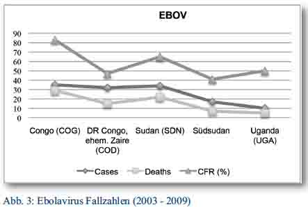 Abbildung 3 zeigt die Ebola-Ausbrüche aus den Einsatzländern Kongo, Demokratische Republik Kongo, Sudan, Süd-Sudan und Uganda aus den Jahren 2003 – 2009 [8] und gibt Aufschluss über die hohe Letalität der Erkrankung, die mit 25 – 90 % angegeben wird [9].