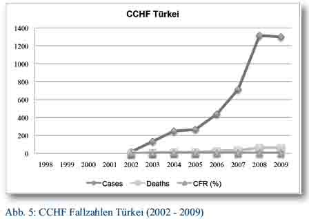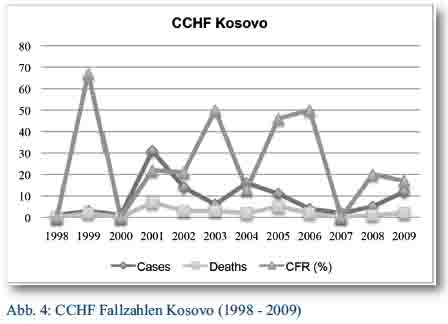 Die Abbildungen 4 und 5 zeigen eine deutliche Zunahme der Erkrankungszahlen für das Krankheitsbild CCHF in der Türkei und dem Kosovo. Laut einer Meldung aus dem National Public Health Institute of Kosovo wurden allein im Zeitraum März bis Juni 2013 2875 Zeckenstiche, davon 77 CCHF-Verdachtsfälle und 17 positiv bestätigte CCHF-Fälle erfasst, von denen fünf tödlich verliefen.