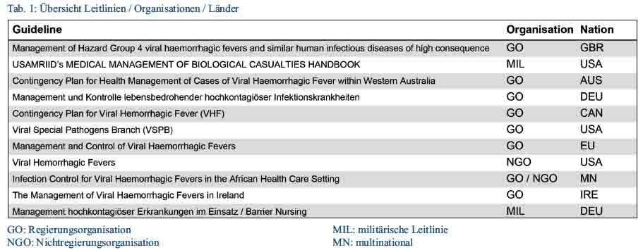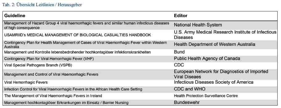 Die Konfrontation mit seltenen, aber bedrohlichen Krankheitsbildern ist mittlerweile Gegenstand des Bundeswehralltags in gegenwärtigen Auslandsmissionen. Auch vor dem Hintergrund der eingangs geschilderten Verläufe von VHF-Verdachtsfällen ist folgende Fragestellung begründet: Hält das Bundeswehr-eigene Konzept dem Vergleich mit anderen Leitlinien stand und ist es gegenüber der aktuellen Bedrohungslage angemessen?