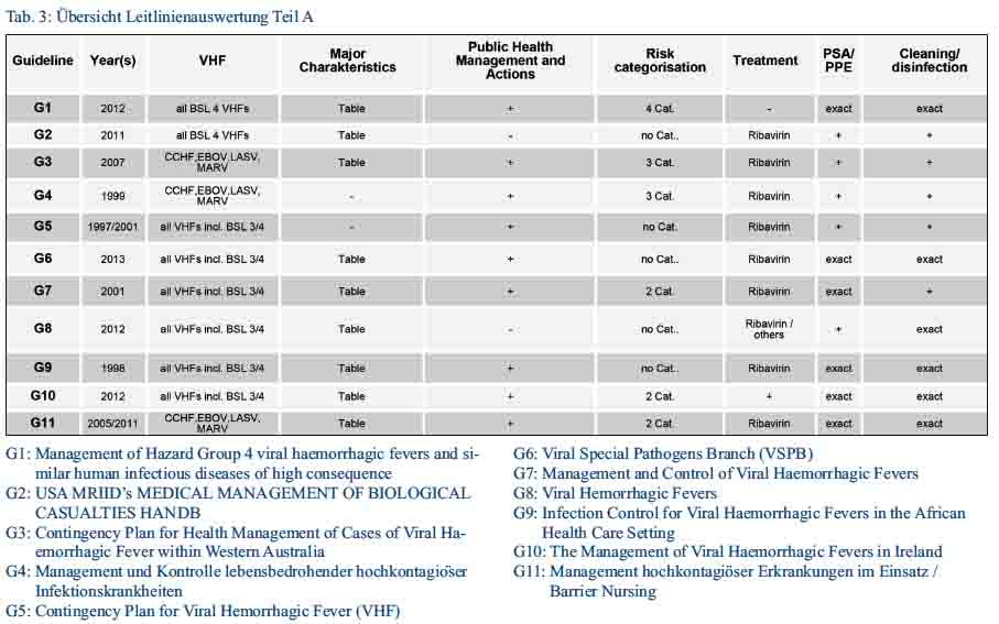 Allen Leitlinien ist gemein, dass im Einleitungsabschnitt eine Vorstellung der viralen hämorrhagischen Fieber z. T. mit Darstellung der epidemiologischen Kennzahlen erfolgt. Neben der Beschreibung der Krankheitsbilder gibt es bei 9/11 der Leitlinien eine tabellarische Übersicht über die wichtigsten viralen hämorrhagischen Fieber (Tab. 3), bei 6/11 werden zusätzlich VHF des BSL-3 vorgestellt (Tab. 3). 10/11 Leitlinien beschreiben die unspezifische Symptomatik zu Beginn einer VHF-Erkrankung und führen wichtige Differentialdiagnosen zur Eingrenzung (z. B. Malaria) auf.