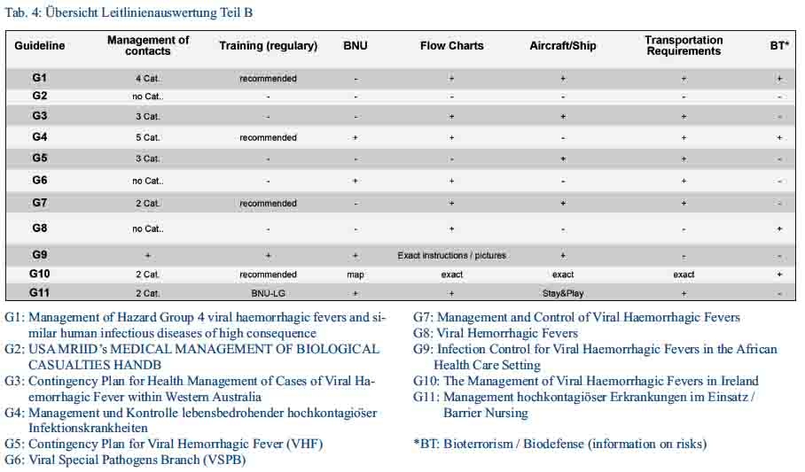 9/11 Leitlinien weisen neben ausführlichen Inhaltsverzeichnissen eine Vielzahl von schematischen Ablaufplänen und Flussdiagrammen (Flowcharts) auf, die der übersichtlichen Darstellung von Prozessen und Entscheidungsfindung im Umgang mit VHF-Fällen dienen (Tab. 4). Die Bandbreite reicht von Maßnahmen der Isolation, des Personalschutzes bis hin zum sachgerechten Handling von Proben.