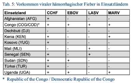 Tab. 5: Vorkommen viraler hämorrhagischer Fieber in Einsatzländern