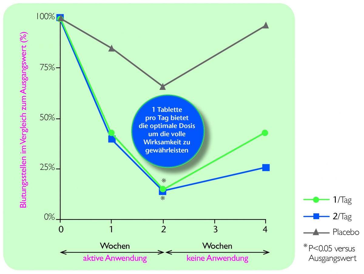 In mehreren Untersuchungen konnte gezeigt werden, dass L. reuteri Prodentis® in der Lage ist, das Wachstum parodontalpathogener Keime effizient zu hemmen. Teughels et al. sowie Vicario et al. konnten nachweisen, dass GUM® PerioBalance® als Therapieergänzung zu Scaling and Root Planing (SRP) die klinischen Parameter Sondierungstiefe, Blutungs-Index und Plaque-Index erheblich verbessert 3, 4 . Ein Systematic Review hat gezeigt, dass SRP plus probiotische Behandlung im Vergleich zu SRP alleine einen signifikanten CAL-Gewinn (clinical attachment level) sowie eine signifikante Reduktion der Blutung bei Sondierung nach sich ziehen 5 . In einer aktuellen Studie bei Mukositis-Patienten war Lactobacillus reuteri Prodentis – im Vergleich zur Placebo-Gruppe – in der Lage, die klinischen Parameter (Sulkusflüssigkeit, Plaque- und Gingiva-Index, Sondierungstiefe) zu verbessern und auch die Zytokin-Level zu senken 6 . Die Autoren schlussfolgern aus der Tatsache, dass der Keim auch bei gesunden Patienten wirksam war, dass Lactobacillus reuteri nicht nur zur Therapie, sondern auch zur Prävention einer Mukositis geeignet scheint. Eine ausgeprägte Reduktion der periimplantären Mukositis, verbesserte Plaquekontrolle und reduzierte Sondierungstiefen durch den regelmäßigen Verzehr von GUM® PerioBalance® Lutschtabletten bestätigt auch eine neue Dissertationsarbeit 7 . Zur Minimierung des Risikos eines Pilzbefalls der Mundhöhle mit Candida albicans bei Senioren trägt das Bakterium ebenfalls bei8 .