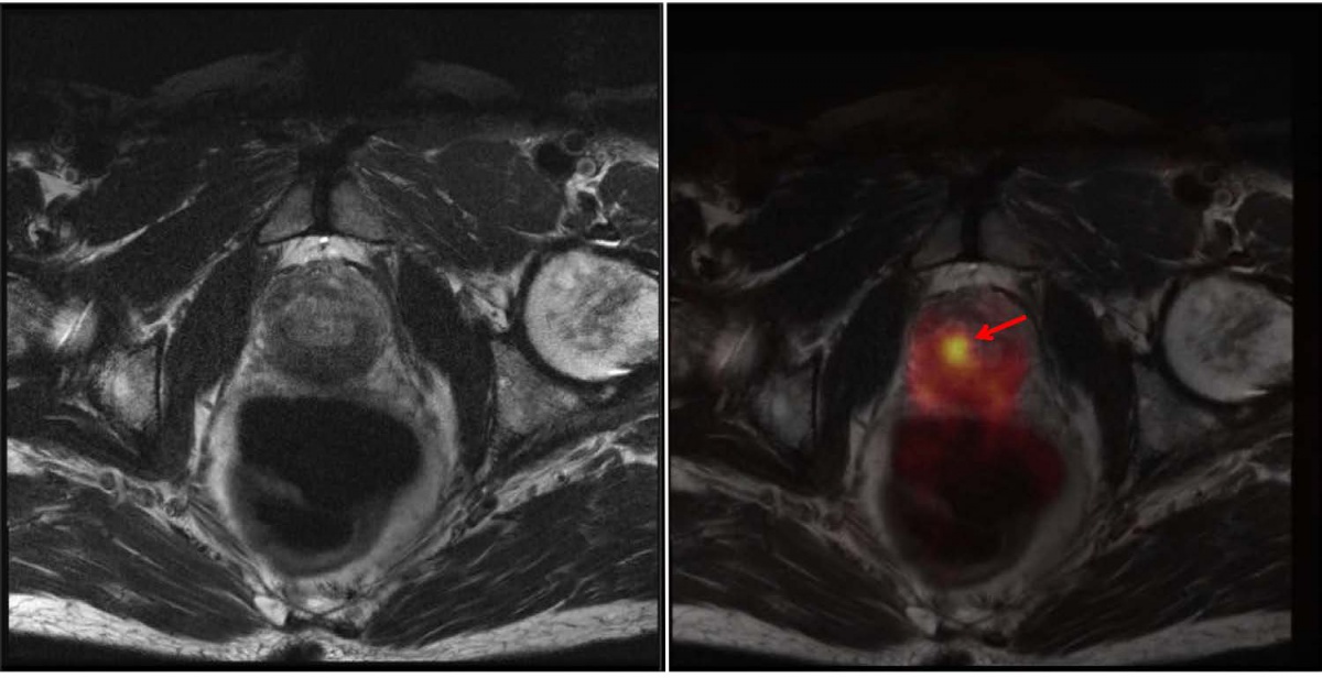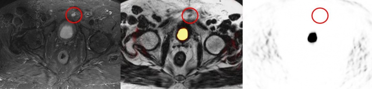 Bei einem Patienten waren drei im PET/CT hochstoffwechsel-aktive Prostatakarzinomherde im PET/MRT nicht abgrenzbar; der intraprostatische PET/MRT-Befund war nicht beurteilbar.
