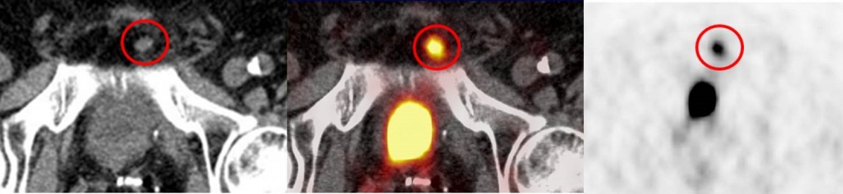 infrapubisch im Nativ-CT (links) mit deutlich erhöhter PSMA-Avidität im PET (rechts)