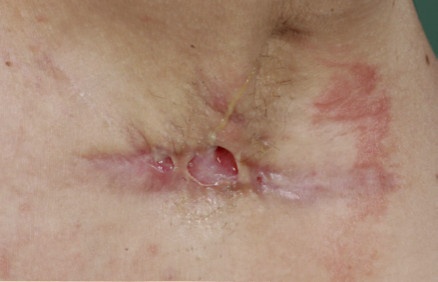 Wir haben uns in unserer Abteilung auf die chirurgische Sanierung der Pyodermieherde spezialisiert, da diese die tragende Säule der Therapie im Stadium II und III n. Hurley darstellt. Hierbei führen wir die komplette operative Exzision der erkrankten Areale mittels HF- Chirurgie teils bis epifaszial und wenn erforderlich auch tiefer (Grad II-III) sowie die totale Exzision einzelnen Knoten (St. I-II) leitliniengemäß durch. Hierbei sollten Fistelgänge an der Basis sowie randbildend dargestellt und komplett exzidiert werden. Dies kann intraoperativ durch Anfärbung erleichtert werden. Konservative kurative Therapieoptionen liegen nicht vor, so dass es sich hierbei um die Therapie der Wahl handelt. Die Radikalität der chirurgischen Therapie und die Rezidivquote sind hierbei umgekehrt proportional zueinander. Während die Inzision und einfach Drainage ein bis zu 100%ige Rezidivquote aufweisen, kann die Rezidivhäufigkeit bei radikaler Exzision auf bis zu 2,5 % gesenkt werden. [2] Im Anschluss an die Exzision erfolgt die Einleitung einer offenen Wundbehandlung welche nach Anleitung durch den Patienten selbstständig oder durch einen ambulanten Pflegedienst durchgeführt werden kann. Hierbei erfolgt der Verband mit entsprechenden Wundauflagen (z. B. Allginate) nach Ausduschen und Desinfektion der Areale. In der Folge ist eine Wundtherapie mit Basiscreme ausreichend. Ein primärer Wundverschluss ist nicht zu empfehlen und führt gehäuft zu Rezidiven. Trotz der, teils ausgedehnten, Wundareale sind die Patienten im Allgemeinen relativ schmerzarm und wenig beeinträchtigt so dass die zeitnahe Rückkehr in den Arbeitsalltag möglich ist. Der stationäre Aufenthalt beträgt in der Regel zwei Tage und ergibt sich insbesondere durch das bestehende Nachblutungsrisiko. Die kosmetischen Ergebnisse nach sekundärer Wundheilung sind gut, es sollte jedoch auf den bereits frühzeitigen Beginn von Bewegungs- und Dehnübungen geachtet werden, um die Ausbildung von Narbenstrikturen mit Bewegungseinschränkungen zu verhindern. In Einzelfällen ist bei ausgedehnten und tiefreichenden Exzisionsarealen nach ausreichender Wundgranulation eine Spalthauttransplantation als grobes Mesh erwägenswert.