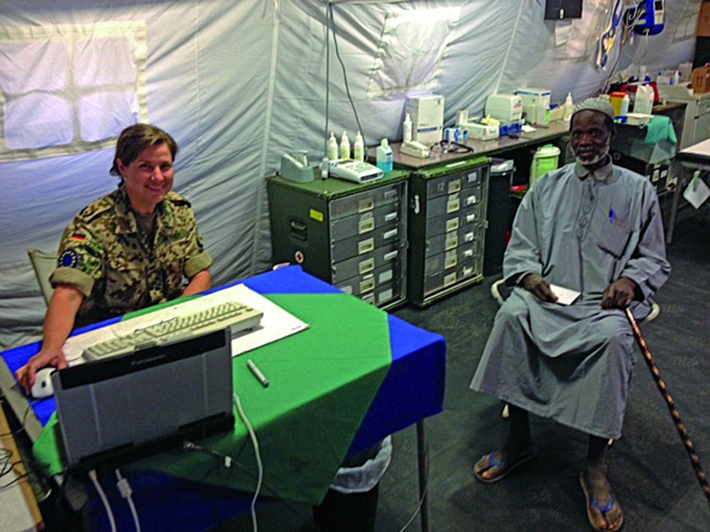 Dafür muss er in der Lage sein, durch seine umfassende generelle und tropenmedizinische Expertise und die während der Ausbildung erworbene Felderfahrung die bestmögliche medizinische Versorgung sicherzustellen. Er berücksichtigt differenzialdiagnostisch ein immer neues Spektrum von Erkrankungen, abhängig von Ort, Jahreszeit, Epidemiologie, Exposition und nicht zuletzt klinischer Präsentation. Er weiß um die Notwendigkeit der multinationalen Verständigung und Zusammenarbeit (Abbildung 3) und ist die letzte fachlich entscheidende Instanz im konservativen Bereich in einer kleinen vorgelagerten Role 1- oder Role 2-Sanitätseinrichtung (Abbildung 4).