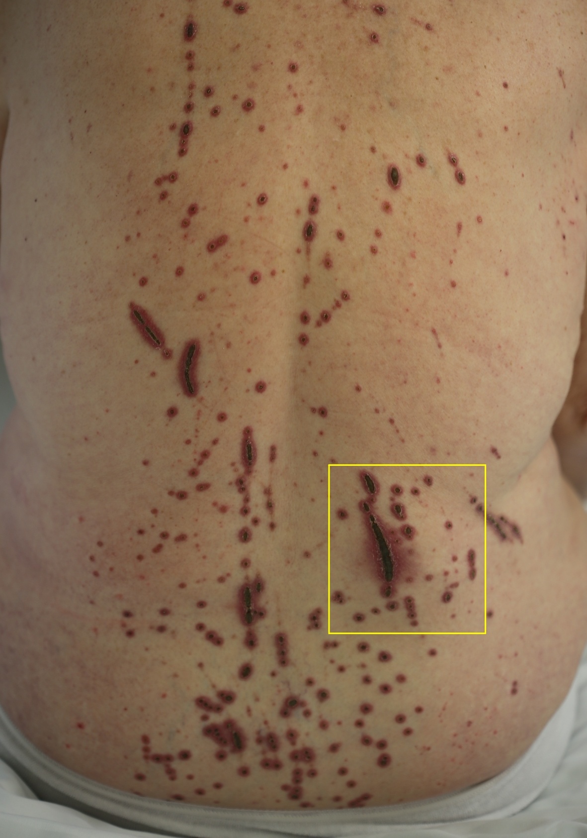 Eine 76-jährige Patientin stellte sich erstmalig im November 2017 in unserer dermatologischen Ambulanz prästationär vor. Sie litt seit ca. 6 Wochen an einem starken Pruritus am gesamten Integument, insbesondere der untere Rücken war stark betroffen. Ein Therapieversuch war zu diesem Zeitpunkt nicht unternommen worden. Die Patientin hatte bisher keine dermatologischen Vorerkrankungen und hatte keine Umstellung in der bisherigen Lebensweise bzw. bisherigen Medikation erfahren. An Begleiterkrankungen bestanden ein permanentes Vorhofflimmern, arterielle Hypertonie, nicht insulinpflichtiger Diabetes mellitus Typ 2, COPD, Zustand nach mechanischen Aortenklappenersatz und ein durchgemachter Kleinhirninfarkt.
