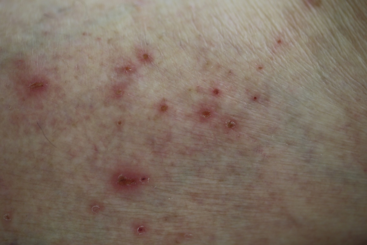 Bei einer 84-jährigen Patientin, die sich in unserer dermatologischen Ambulanz am Mitte November 2017 prästationär vorstellte, bestand – bei zuvor stets blandem Hautbefund – seit etwa 3 Monaten ein stark juckendes pruriginöses Ekzem am gesamten Integument. Unter Verdacht auf eine Skabiesinfek-tion wurde sie extern zweimalig topisch therapiert. Der Hautbefund besserte sich hierunter rasch, der Juckreiz blieb jedoch weiterhin bestehen.