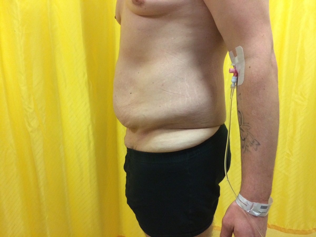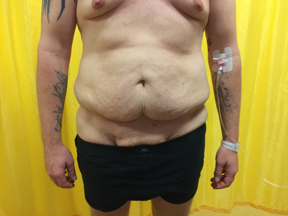 36-jähriger Soldat mit deutlichem abdominalen Gewebüberschuß nach 50 kg Gewichtsreduktion. Es besteht eine dauerhafte Reizung der Hautfalte sowie Schmerzen beim Tragen der Dienstbekleidung (Abb. 6-8).