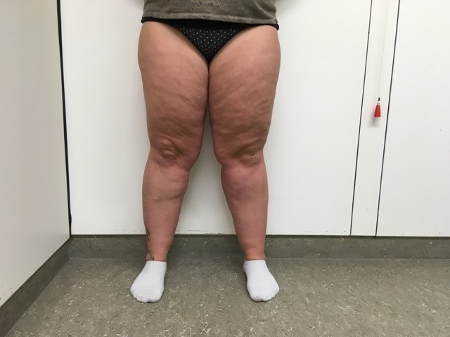 32jährige Patientin: Lipödem Oberschenkel und Unterschenkel beidseits Stadium 3. Beschwerden: Seit 10 Jahren Schmerzen und Druckgefühl in den Beinen, Verstärkung der Beschwerden nach der Schwangerschaft. Tragen der Kampfstiefel nur möglich, wenn diese oben nicht geschnürt werden, kein Marsch und Laufsport möglich wegen Schmerzen in den Beinen. Beginnende Achsabweichung der Beine. Keine wesentliche Besserung trotz Lymphdrainage und dauerhaftem Tragen der Kompressionsstrumpfhose.