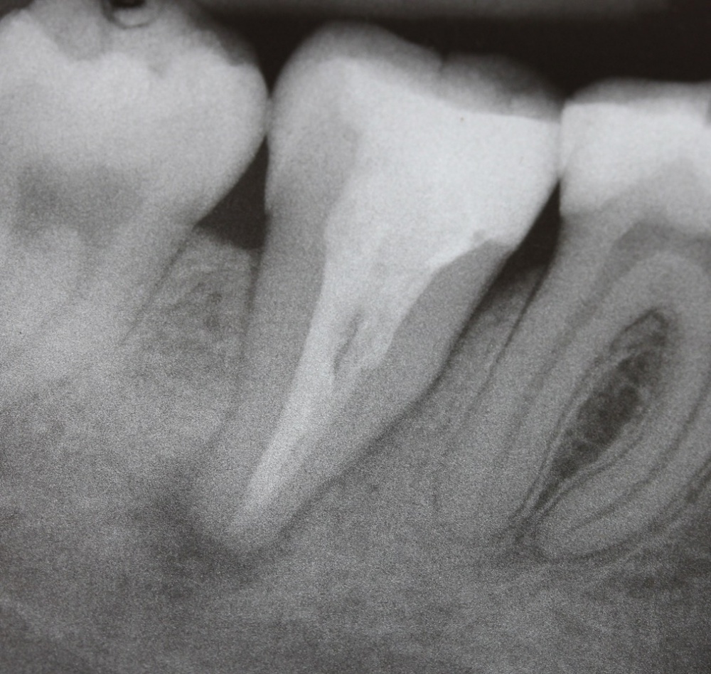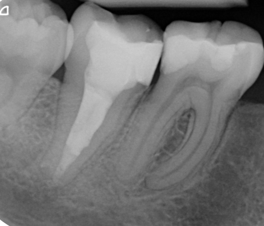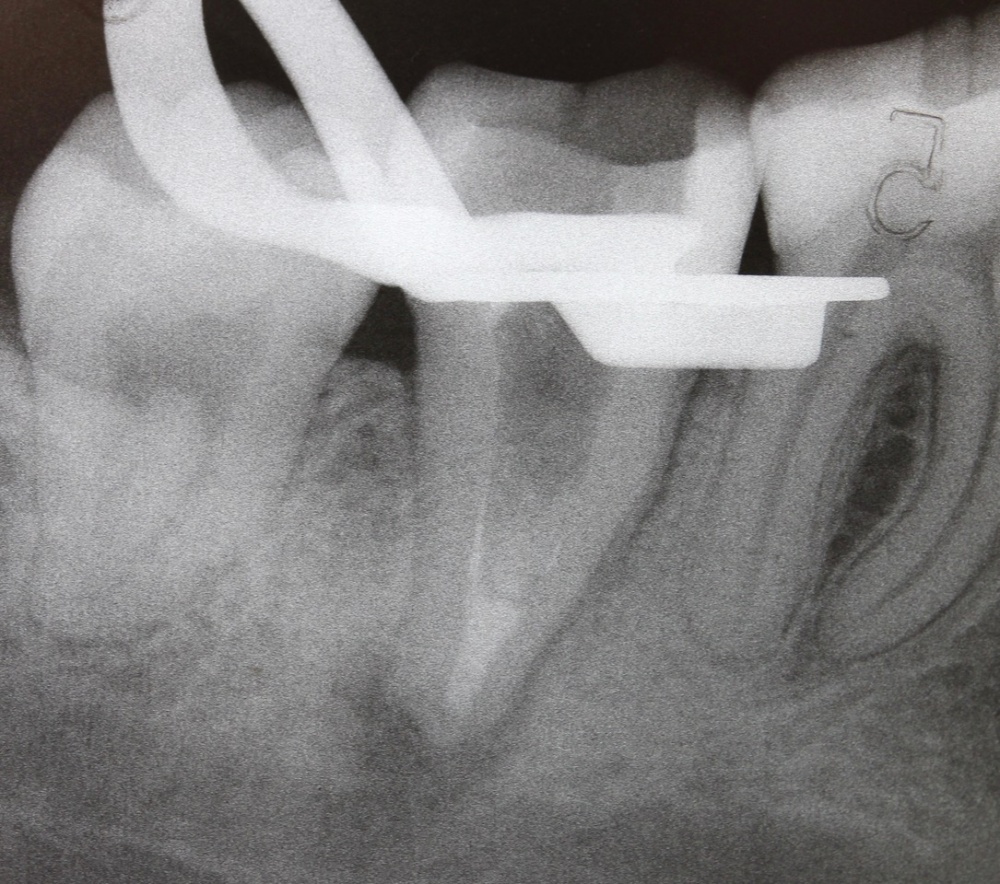 Im ersten Fall stellte sich die Patientin nach bereits erfolgter endodontischer Behandlung an Zahn 47 mit Beschwerden, die insbesondere bei okklusaler Belastung auftraten, vor. Die Provokation mittels Perkussion fiel positiv aus. Das daraufhin angefertigte Röntgenbild (Abb. 1) zeigte eine bis zum Apex reichende Wurzelfüllung mit apikaler Aufhellung und Ausdehnung der Osteolyse bis zum Dach des Nervus alveolaris inferior. Insgesamt war die Wurzelfüllung als inhomogen zu bewerten. Nach Aufklärung über die Therapiealternativen entschied sich die Patientin für einen Revisionsversuch.
