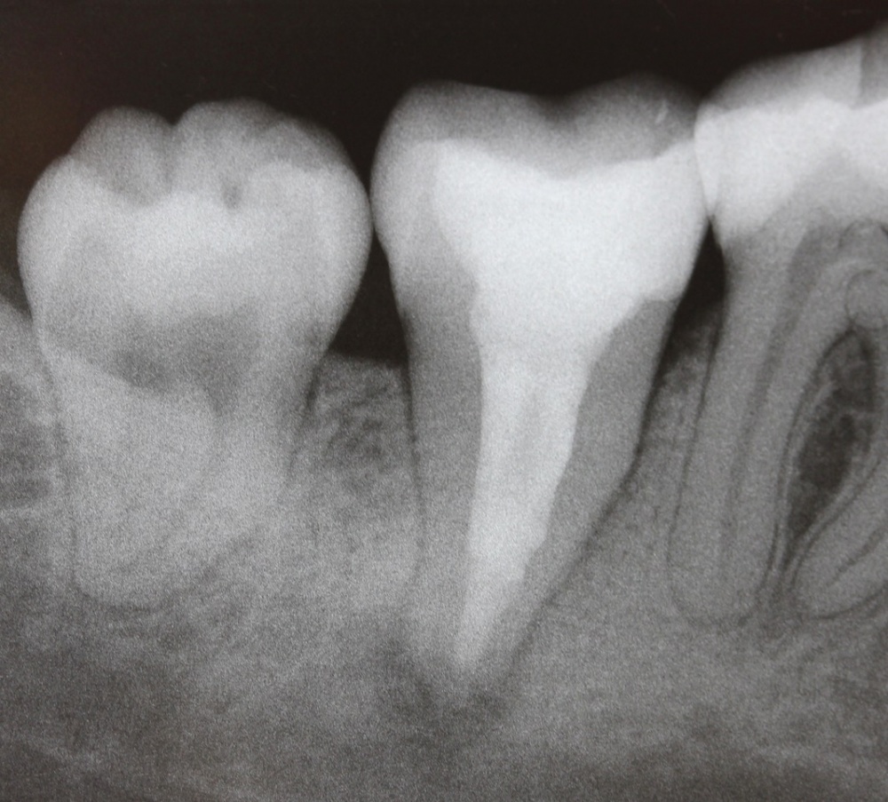 Ein nach Applikation des MTA angefertigtes Kontrollbild zeigt den suffizienten apikalen Verschluss der Konstriktion in einer Schichtstärke von etwa vier Millimeter (Abb. 2). Gleichzeitig wird in der Aufnahme die ausgedehnte Kanalstruktur des Zahnes 47 deutlich.