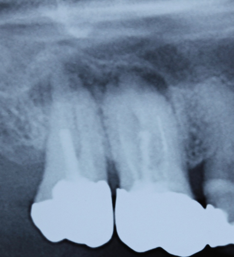 Im nächsten Fall stellte sich ein Patient mit reizunabhängigen Beschwerden und Perkussionsempflindlichkeit an Zahn 17 vor. Begleitend lag eine Lockerung Grad I bis II vor. Das daraufhin angefertigte Röntgenbild (Abb. 5) zeigt eine insuffiziente Wurzelfüllung, nebst Wurzelstift und einer umfangreichen apikalen Osteolyse. Darüber hinaus scheint Zahn 16 ebenfalls apikal beherdet zu sein und im Bereich der mesialen Wurzel besteht der Verdacht eines frakturierten Wurzelkanalinstrumentes.