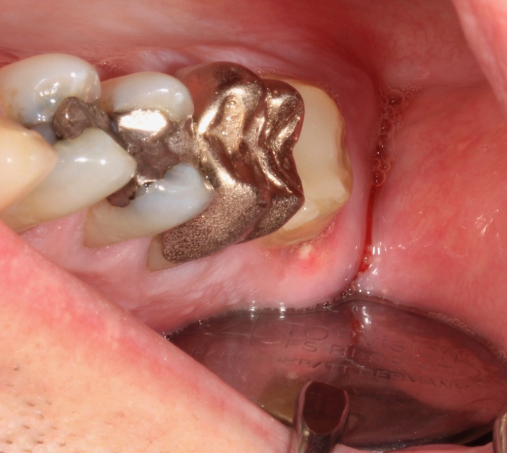 Eine Woche nach Wurzelfüllung wurde der Patient aufgrund von Schmerzen und einer Schwellung im disto-cervikalen Bereich des Zahnes 17 vorstellig (Abb. 8).
