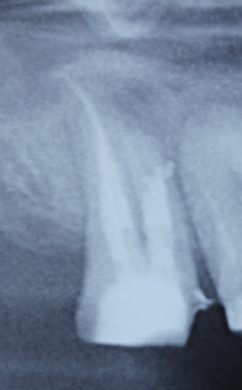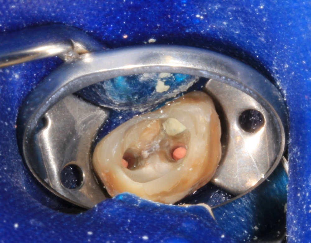 Die Revision des mesiobukkalen Kanals gestaltete sich aufgrund der ausgeprägten Sklerosierung sehr schwierig und musste letztendlich frustran abgebrochen werden, da sich der apikale Bereich der Wurzel auch nach zeitintensivem Einsatz nicht weiter aufbereiten ließ. Der zweite mesiobukkale Kanal konnte auch nach intensiver Suche nicht aufgefunden werden. Nach Entfernung der alten Wurzelfüllung und Aufbereitung der Wurzelkanäle wurde eine medikamentöse Einlage mit Calciumhydroxid für eine Woche durchgeführt. Vor Obturation der Kanäle kam es durch Abtragen eines Überhanges im Bereich des mesiobukkalen Kanaleinganges zu einer Perforation im Furkationsbereich.
