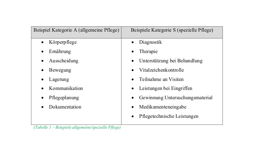 Die individuell tägliche Einstufung der Patienten in die Kategorie A für „allgemeine Pflege“ und S für „spezielle Pflege“ (Tab. 1) wurde beibehalten. Desweiteren wurden die Leistungsbeschreibungen zu den Einstufungen verändert und alle Zeitkategorien neu berechnet. Der bis dahin geltende Pflegekomplexmaßnahmen-Score wird abgeschafft und in die neuen Kategorien A4 und S4 überführt. [4]