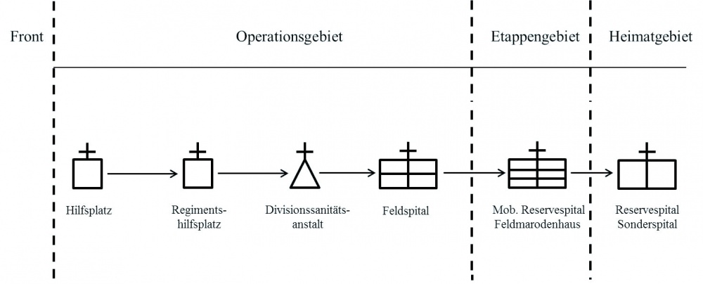 Erste Anlaufstelle für Verwundete waren die Verwundetennester in unmittelbarer Nähe der Gefechtshandlungen. Dort leisteten Krankenträger erste Hilfe und brachten die Verwundeten anschließend zum zwei bis drei Kilometer hinter der Frontlinie liegenden Truppenverbandplatz. Nach Kreislaufstabilisierung und Herstellung der Transportfähigkeit erfolgte der Abtransport über den Hauptverbandplatz, Feld- und Kriegslazarette in Reservelazarette [19].