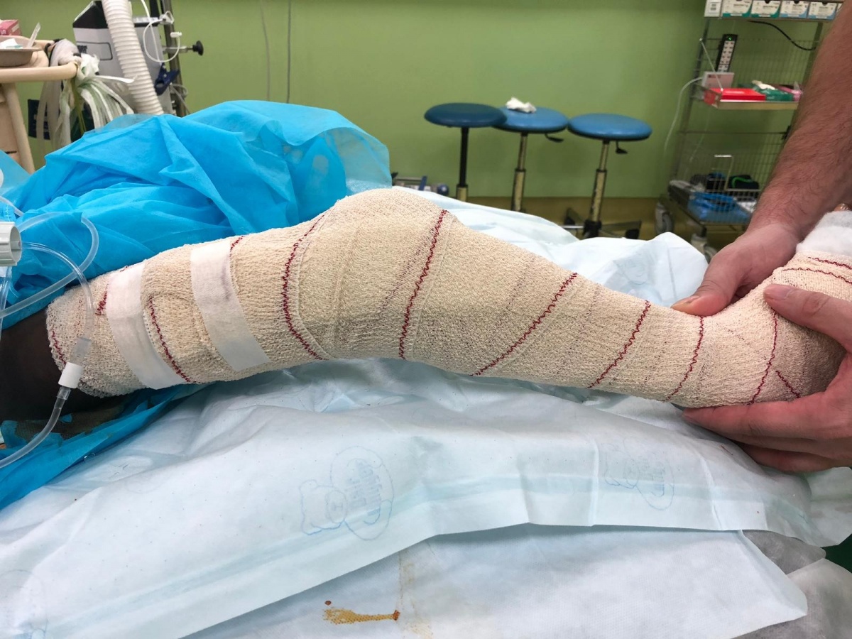 Hauptaufgabe unserer OP-Gruppe war die chirurgische Versorgung der französischen Soldaten und deren Angehöriger. Zusätzlich wurden uns durch einen einheimischen Kooperationspartner zivile Patienten vorgestellt, die einer chirurgischen Intervention bedurften. Beispielhaft für diverse Eingriffe bei Kindern soll die Arthrolyse bei einem 7-jährigen Jungen gezeigt werden. Dieser wurde uns mit einer Beugekontraktur nach Verkehrsunfall und Tibiakopffraktur vor einem Jahr vorgestellt. Das Bewegungsausmaß betrug 0 – 95 – 105° (Abb. 4).