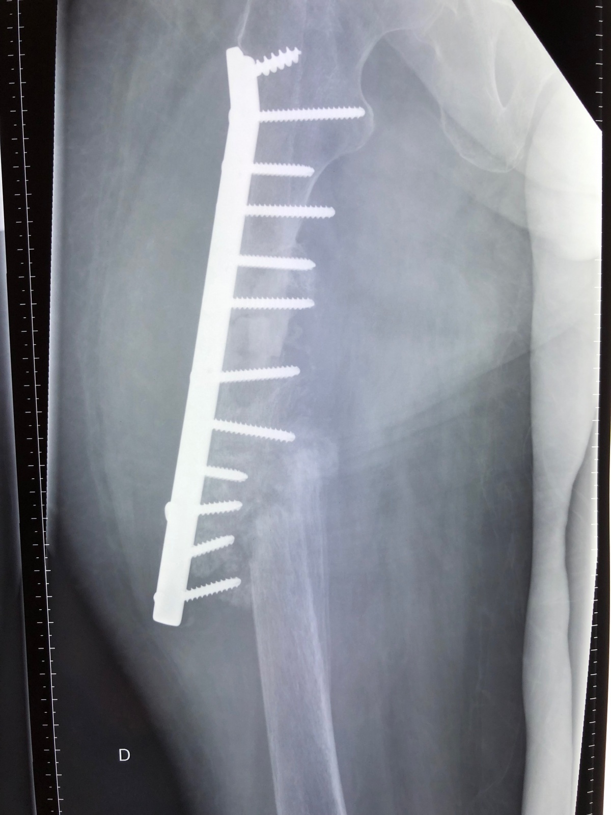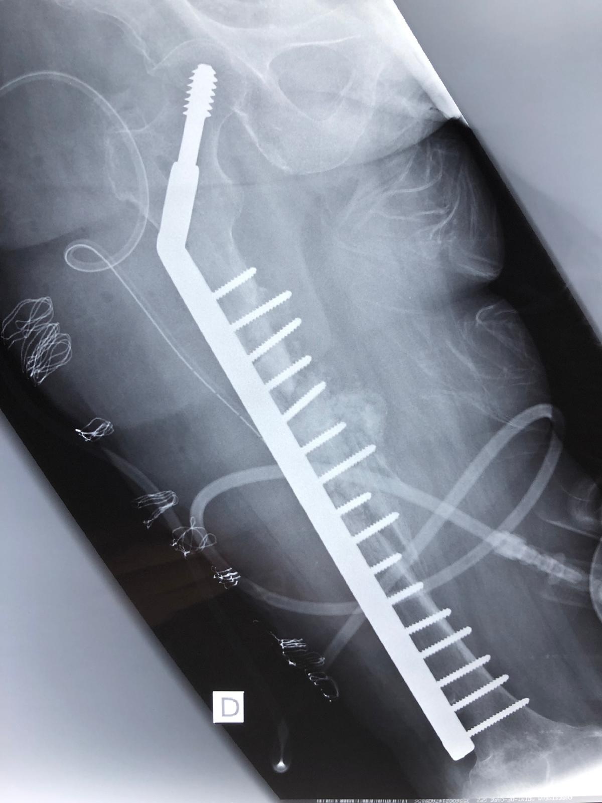 Die Fortbewegung war nur krabbelnd und hüpfend möglich. Im Röntgenbild sah man Residuen der Tibiakopffraktur sowie eine Verkalkung im Bereich der dorsalen Kapsel. Es erfolgte eine Arthrolyse des Kniegelenkes ventral und dorsal, gefolgt von einer redressierenden Gipsanlage (Abb. 4), wodurch die Beugekontraktur auf eine ROM von 0 – 20 – 110° erweitert werden konnte. Die verkürzte Muskulatur wird jetzt physiotherapeutisch behandelt und der Patient war zum Abschluss der Behandlung gehfähig. Ein zweiter wesentlicher Part der chirurgischen Tätigkeit stellte die Revision unzureichender Heilungsergebnisse dar. Die Ursachen hierfür waren heterogen. Fehlende Verfügbarkeit geeigneten Materials und unzureichende Nachbehandlung standen hierbei im Vordergrund. So auch bei unserem 2. Fallbeispiel, einer 51-jährigen Dame, die vor einem Jahr eine Oberschenkelfraktur erlitten hatte und mittels Nagelosteosynthese versorgt wurde. Dieser wanderte proximal aus und bei bestehender Pseudarthrose erfolgte eine Plattenosteosynthese. Leider wurde zur postoperativen Immobilisation eine Mecron-Schiene in Kombination mit einem Rollstuhl gewählt, bei dem leider keine Abstützung des Beines möglich war. So hebelte die Schiene direkt am Ende der Platte und es kam zu einer Anschlussfraktur (Abb. 5) oberhalb der Platte. Diese wurde durch uns revidiert und mit einer DHS mit 16 Löchern ersetzt (Abb. 6). Hierunter konnte letzten Endes eine ausreichende Stabilisierung erreicht werden.