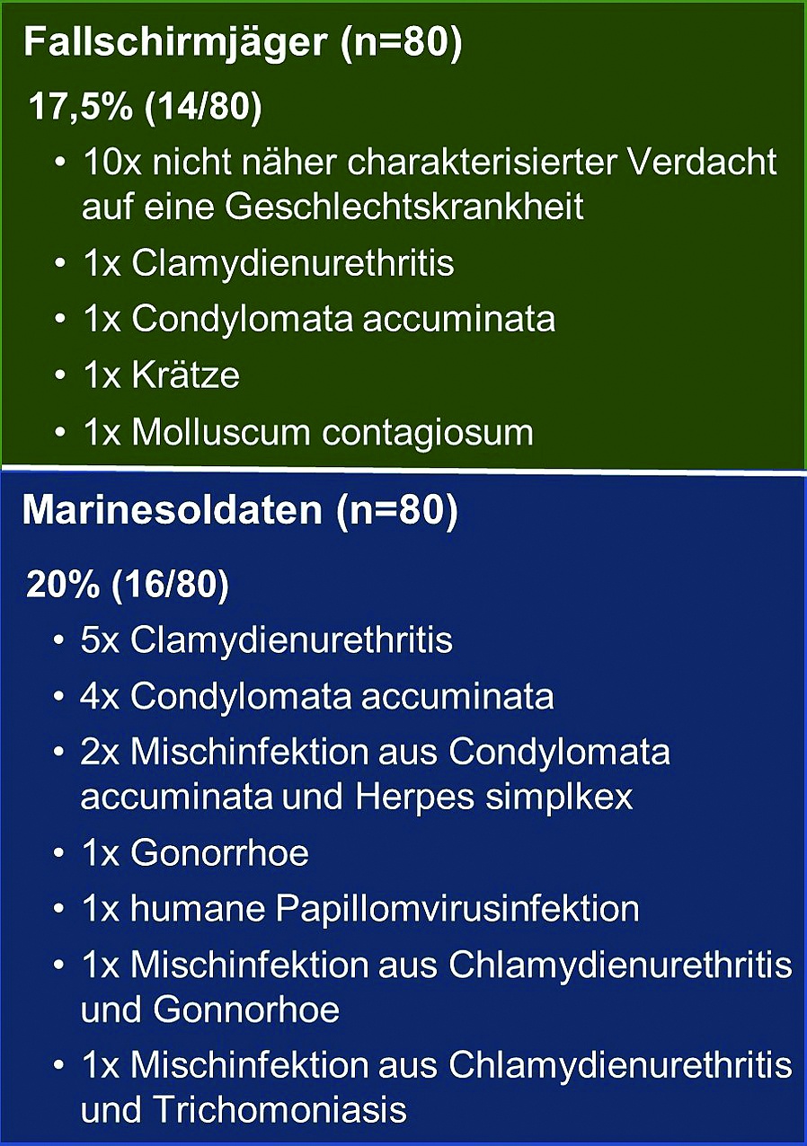 Sexuellübertragbare Infektionen („sexually tansmitted infections“, STI) sind international in den Streitkräften weit verbreitet mit „Lebensprävalenzen“ bis zu 40 % und mehr in Querschnittsstudien [3]. Während die Datenlage zu STI bei US-Soldat(inn)en vergleichsweise gut ist, liegen zu STI bei Soldaten 2 aus Europa nur wenige Informationen vor. Aus diesem Grund wurde eine retrospektive Erhebung der Prävalenz und der Determinanten des Auftretens von STI bei deutschen Fallschirmjägern und Marinesoldaten durchgeführt, indem zufällig ausgewählte Krankenakten aus den medizinischen Abteilungen zweier Kasernen systematisch analysiert wurden. Exemplarisch wurden die Krankenakten von 80 Fallschirmjägern und 80 Marinesoldaten auf Dokumentationen stattgehabter STI und zugehöriger Sexualanamnesen mit Fokus auf dem wahrscheinlichen Übertragungsmodus hin untersucht, um mithin Informationen zu Risikofaktoren sowie Qualitätsdeterminanten des diagnostischen und therapeutischen Managements zu akquirieren.