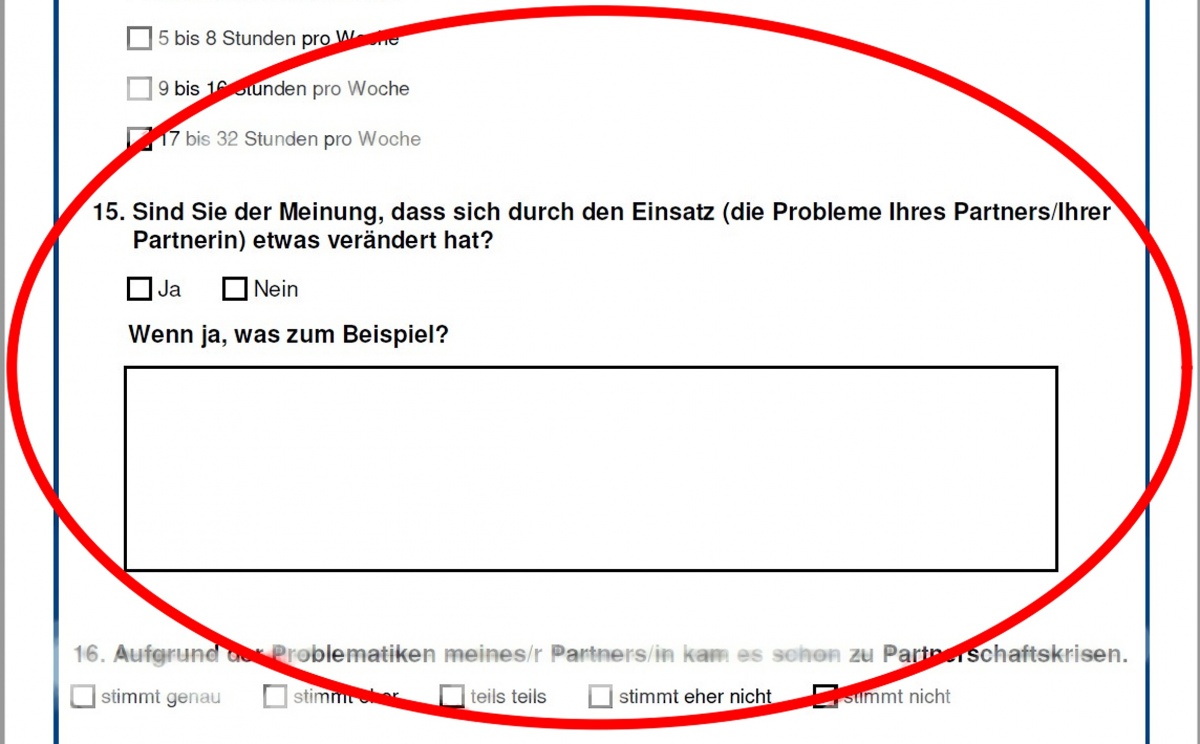 Auf den dichotomen Teil der Frage, ob sich durch den Einsatz die Probleme des Partners/der Partnerin verändert haben, antworteten 83 % mit „Ja“ (39 von 47), 6,4 % mit „Nein“ (3 von 47) und 10,6 % machten keine Angabe (5 von 47). Auf Grundlage der Itemanalyse wurden 9 Kategorien gebildet.