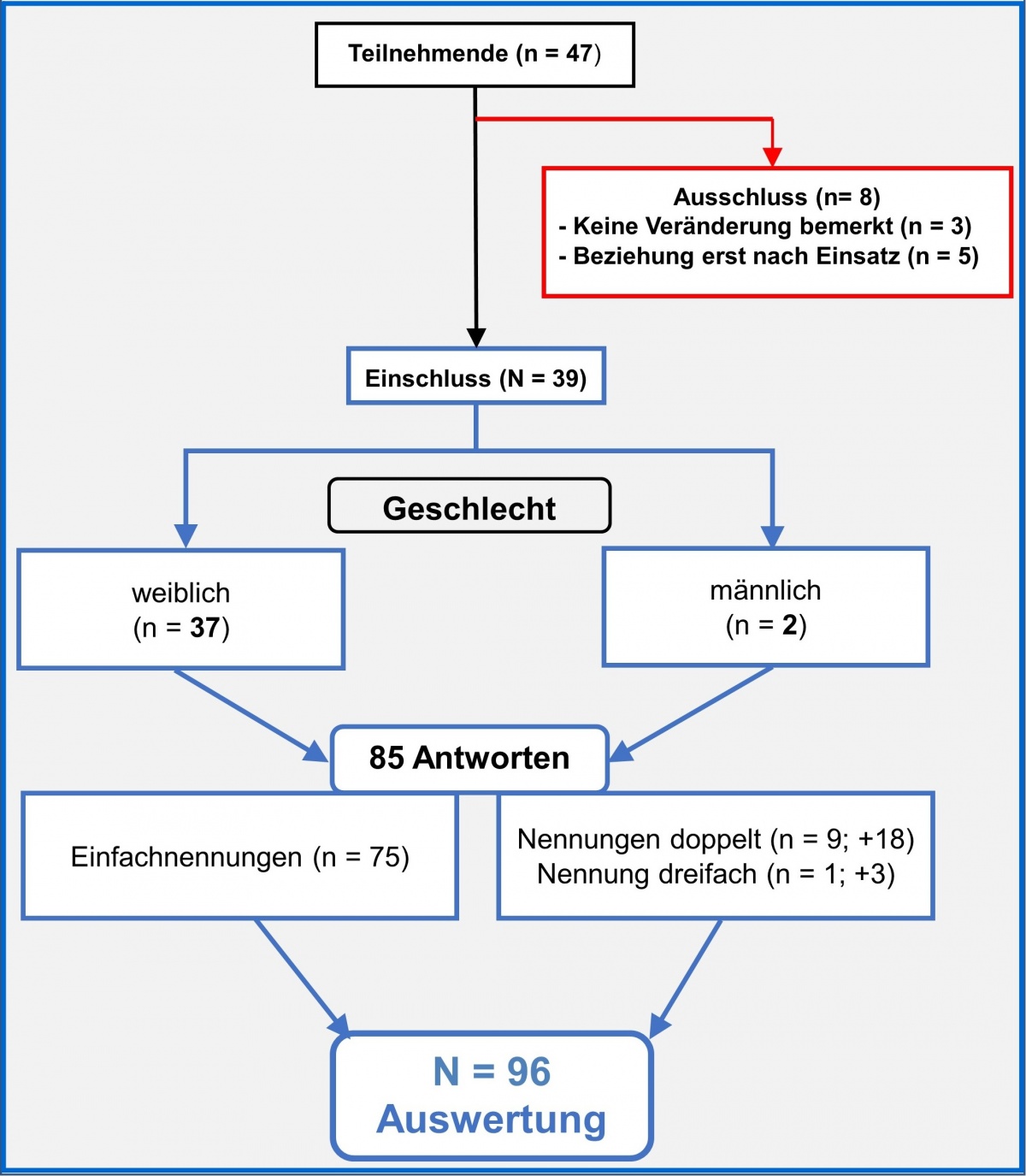 Von den ursprünglich 47 Teilnehmenden des Angehörigenseminars wurden drei Personen ausgeschlossen, da diese keine bemerkten Veränderungen angegeben hatten. Weitere fünf Personen wurden ausgeschlossen, da die Beziehung erst nach dem Auslandseinsatz entstanden war und somit keine Angaben über eine Veränderung gemacht werden konnten. Damit konnten 39 Datensätze ausgewertet werden. Von diesen 39 Datensätzen stammten 37 von weiblichen und 2 von männlichen Angehörigen. Auf eine geschlechtsspezifische Auswertung wurde deshalb verzichtet. Eine detaillierte Auflistung findet sich im Flussdiagramm in Abbildung 2. Das Alter der Angehörigen lag zwischen 21 und 60, im Mittel bei 33,9 Jahren (Median 34 Jahre). 56 % der Teilnehmenden gaben an, Kinder zu haben.