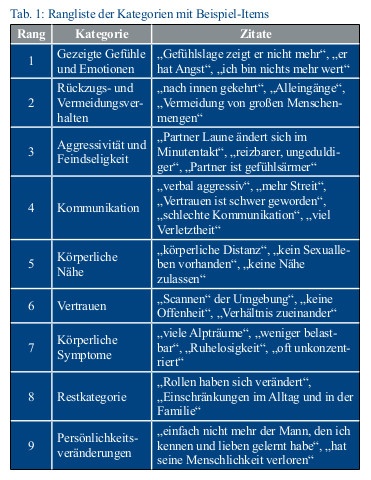 Discussion: The identified problems were categorised without any difficulty. All established categories directly or indirectly influence families and relatives. Apart from the category overlap with PTSD according to ICD-10 diagnostic criteria, the additional problem areas of “physical closeness”, “communication” and “trust” could be identified.